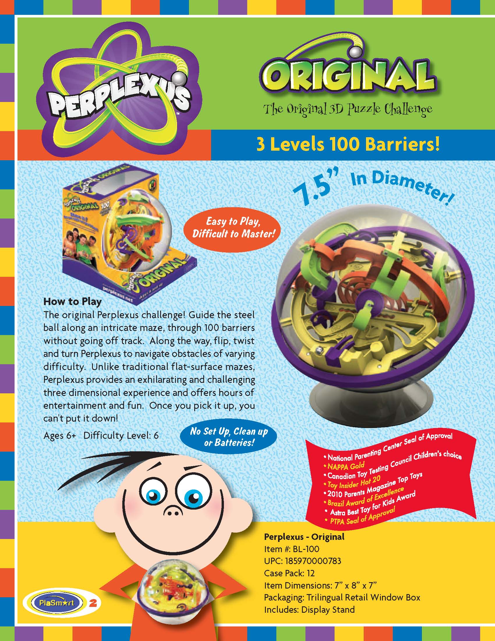 El Perplexus es un entretenido, atractivo y colorido laberinto en 3 dimensiones cerrado en una esfera transparente de plástico que el jugador debe recorrer maniobrando con una pequeña bola de acero sorteando desafiantes puntos. Al contario que lo que sucede en los juguetes con laberintos tradicionales de superficie plana, el laberinto de Perplexus o Superplexus dispone de diferentes pistas con 100 barreras u obstáculos a superar, además de ello, la experiencia que proporcina al niño es tridimensional.